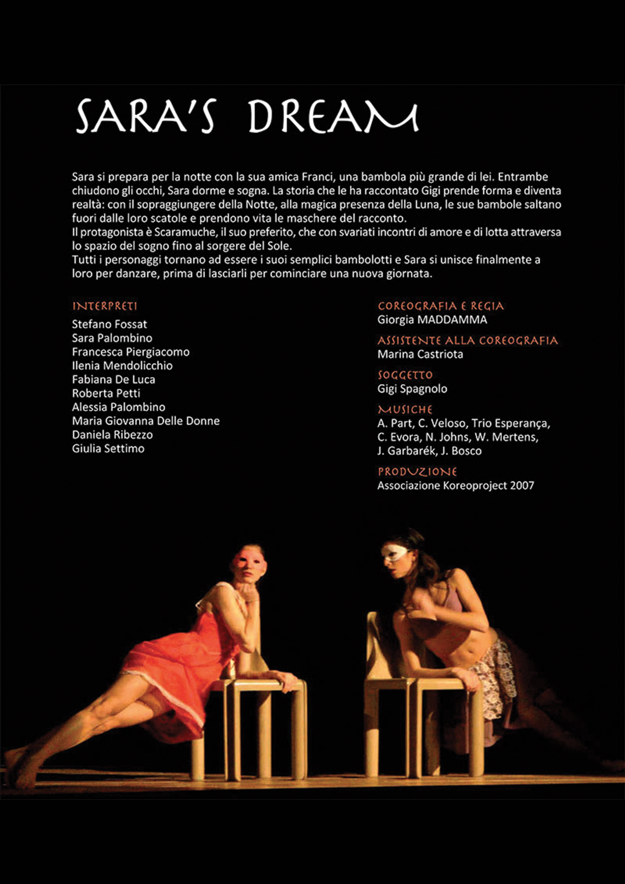 Danzatori: Stefano Fossat, Sara Palombino, Francesca Piergiacomo, Ilenia Mendolicchio, Fabiana De Luca, Roberta Petti, Alessia Palombina, Maria Giovanna Delle Donne, Daniela Ribezzo, Giulia Settimo.